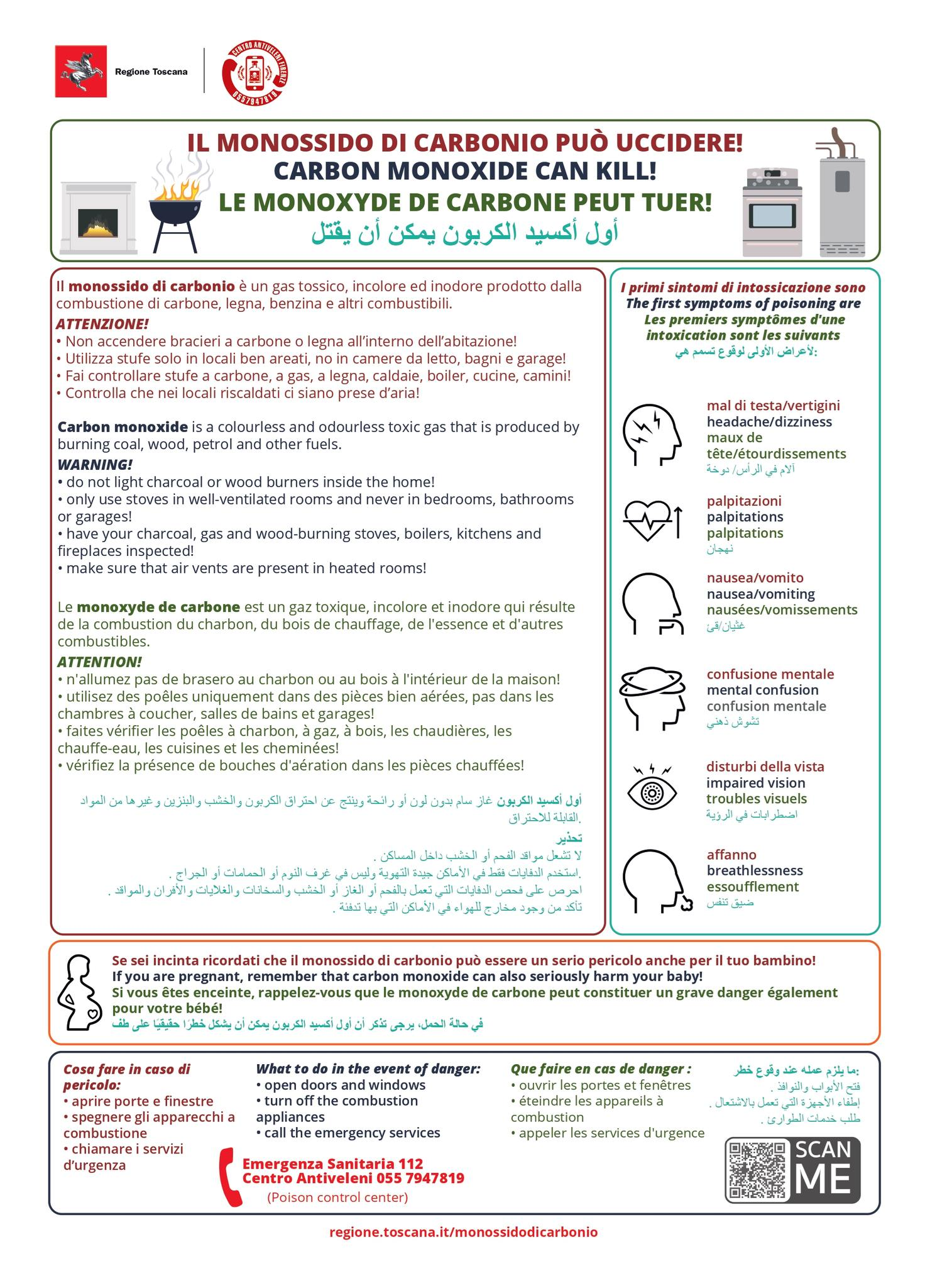 Per rafforzare la prevenzione e aumentare la consapevolezza dei cittadini, la Regione Toscana mette a disposizione materiale informativo multilingue sui rischi del monossido di carbonio e sui comportamenti corretti da adottare -> www.regione.toscana.it/-/monossido-di-carbonio-il-killer-invisibile