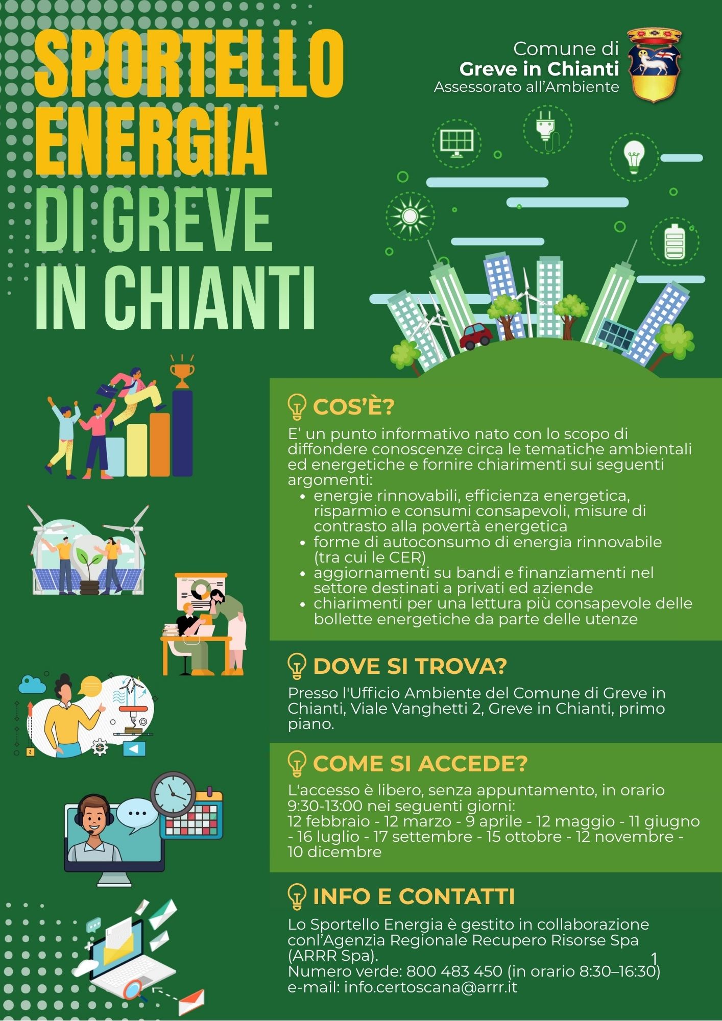 Il Comune di Greve in Chianti ha istituito un punto informativo denominato “Sportello Energia” al fine di diffondere conoscenze circa le tematiche ambientali ed energetiche e fornire chiarimenti sui seguenti argomenti: