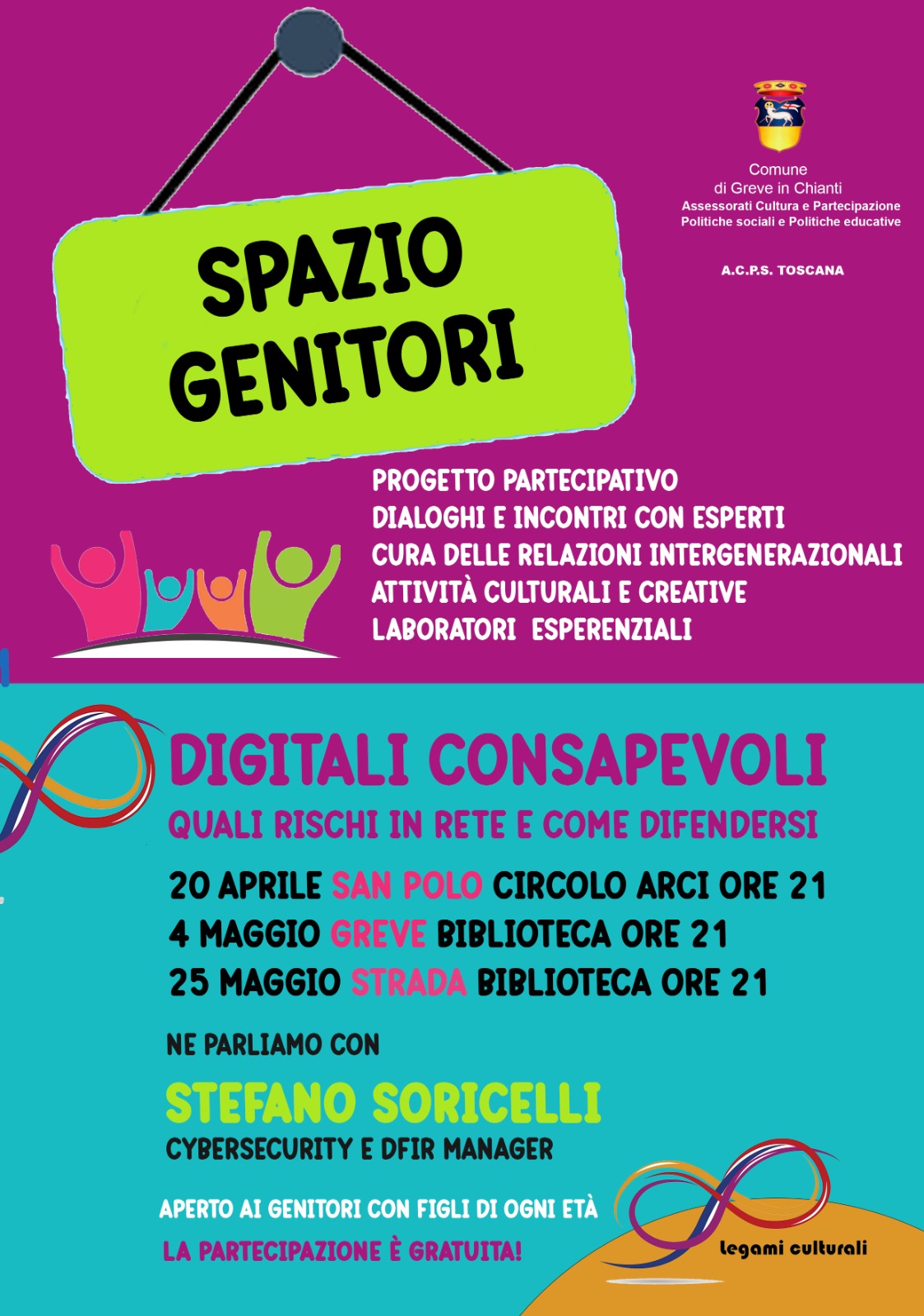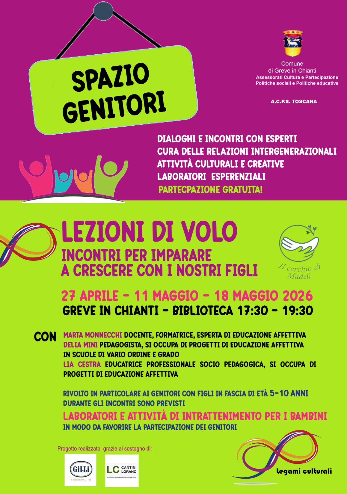 "๐ฆ๐ฝ๐ฎ๐๐ถ๐ผ ๐ด๐ฒ๐ป๐ถ๐๐ผ๐ฟ๐ถ" รจ un progetto partecipativo degli Assessorati alla cultura e partecipazione, alle politiche sociali e alle politiche educative del Comune di Greve in Chianti, in collaborazione con A.C.P.S. Toscana, dedicato alle famiglie, fatto di dialoghi, incontri con esperti, cura delle relazioni intergenerazionali, attivitร culturali e laboratori esperienziali.