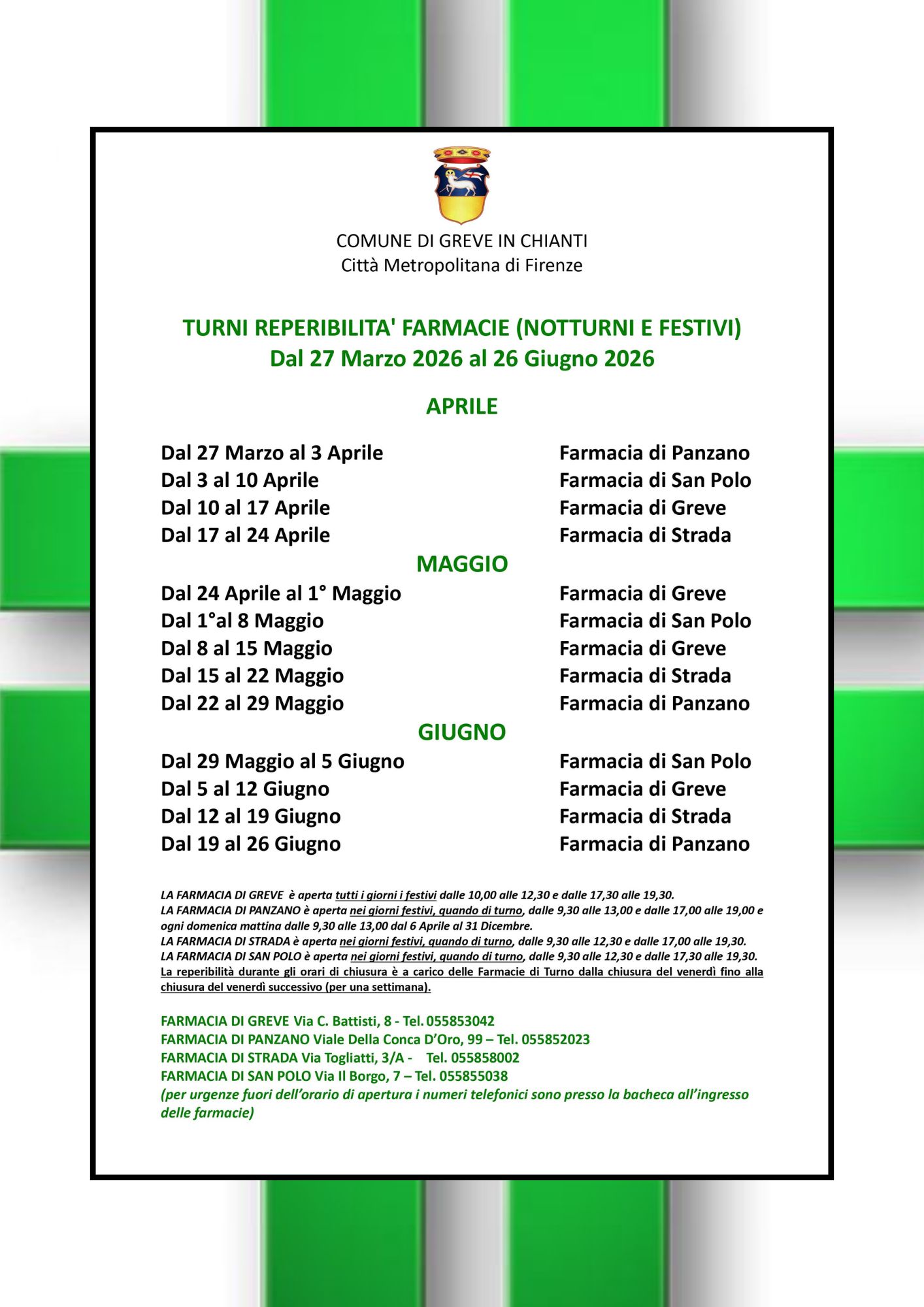 Turni reperibilità farmacie dal 27 marzo al 26 giugno 2026DettagliDescrizione breveTurni notturni e festivi delle farmacie del nostro territorioData:27 Marzo 2026Tempo di lettura:1 minutoCondividi Facebook Twitter Linkedin Telegram WhatsappVedi azioni Scarica Stampa E-mailComunicazione istituzionaleImagefarmacia Descrizione In allegato i turni notturni e festivi delle farmacie del territorio dal 27 marzo al 26 giugno 2026, con info utili e numeri telefonici delle farmacie.Galleria di immaginiImage A cura di Ufficio Stampa Associato Unione Comunale del Chianti FiorentinoL'Ufficio Stampa è gestito in forma associata dai Comuni di Barberino Tavarnelle, San Casciano Val di Pesa e Greve in Chianti
